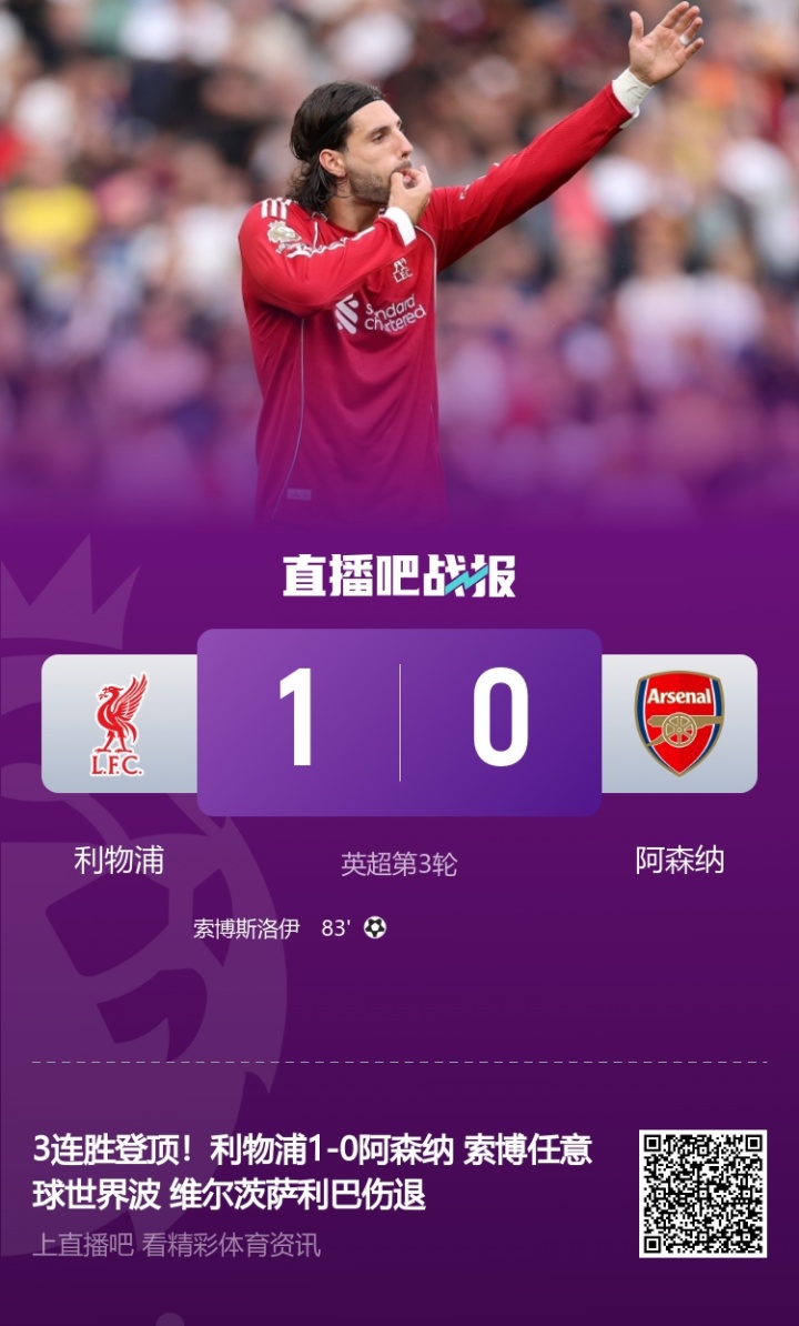 3連勝登頂!利物浦1-0阿森納 索博任意球世界波 維爾茨薩利巴傷退