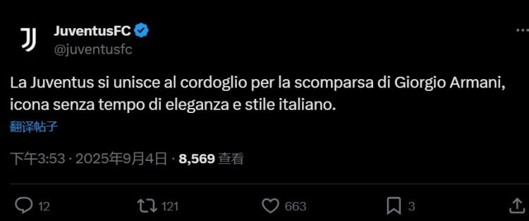 尤文官方寫道:“尤文圖斯俱樂部對喬治-阿瑪尼的逝世表示哀悼,他是意大利優(yōu)雅與風(fēng)格的永恒象征?!?/p>