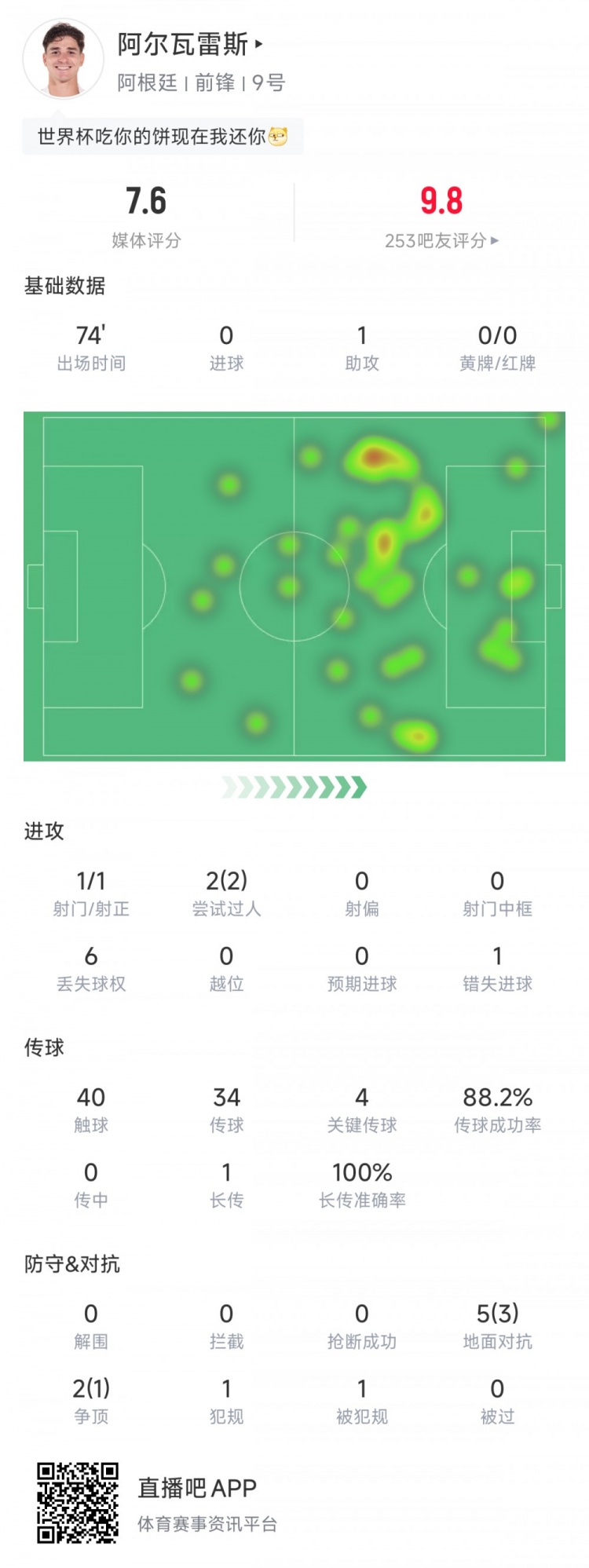 本場(chǎng)比賽,阿爾瓦雷斯出戰(zhàn)74分鐘,1次射門1次射正,送出1次助攻,2次過(guò)人,錯(cuò)失1粒進(jìn)球,4次關(guān)鍵傳球,傳球成功率88.2%,5次地面對(duì)抗3次成功,2次爭(zhēng)頂1次成功。