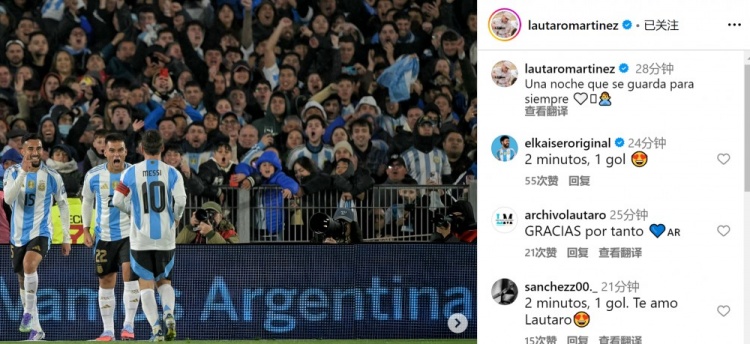 此役是梅西在國內(nèi)為阿根廷出戰(zhàn)的最后一場比賽,勞塔羅社媒曬出與梅西慶祝進(jìn)球的合照,配文:“一個永恒銘記的夜晚?!?/p>