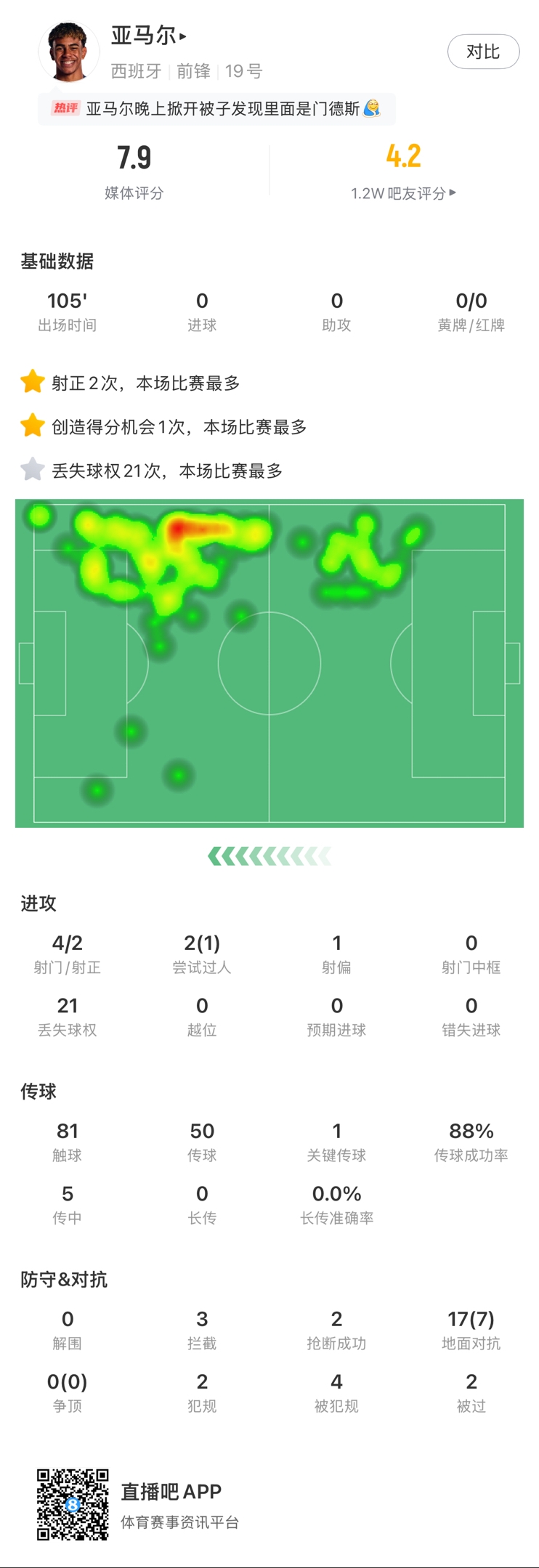 本場比賽,亞馬爾首發(fā)出戰(zhàn)105分鐘,加時賽被換下,未能取得進球或助攻,丟失球權(quán)21次本場最多。亞馬爾以表現(xiàn)不佳輸球和錯失冠軍結(jié)束了17歲這一年。