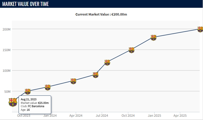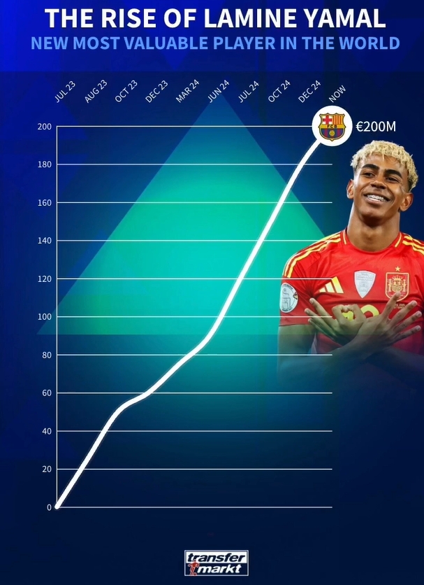 德轉(zhuǎn)發(fā)布亞馬爾身價變化視頻,亞馬爾剛滿16歲時被德轉(zhuǎn)賦予2500萬歐身價,剛滿17歲時直接破億來到1.2億歐,如今在18歲前達到2億歐,不到2年時間便從0飆升到2億歐。
