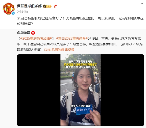 曼聯(lián)官博轉(zhuǎn)發(fā)視頻:“來(lái)自芒特的禮物已經(jīng)準(zhǔn)備好了!萬(wàn)能的中國(guó)紅魔們,可以和我們一起尋找視頻中這位球迷嗎?”