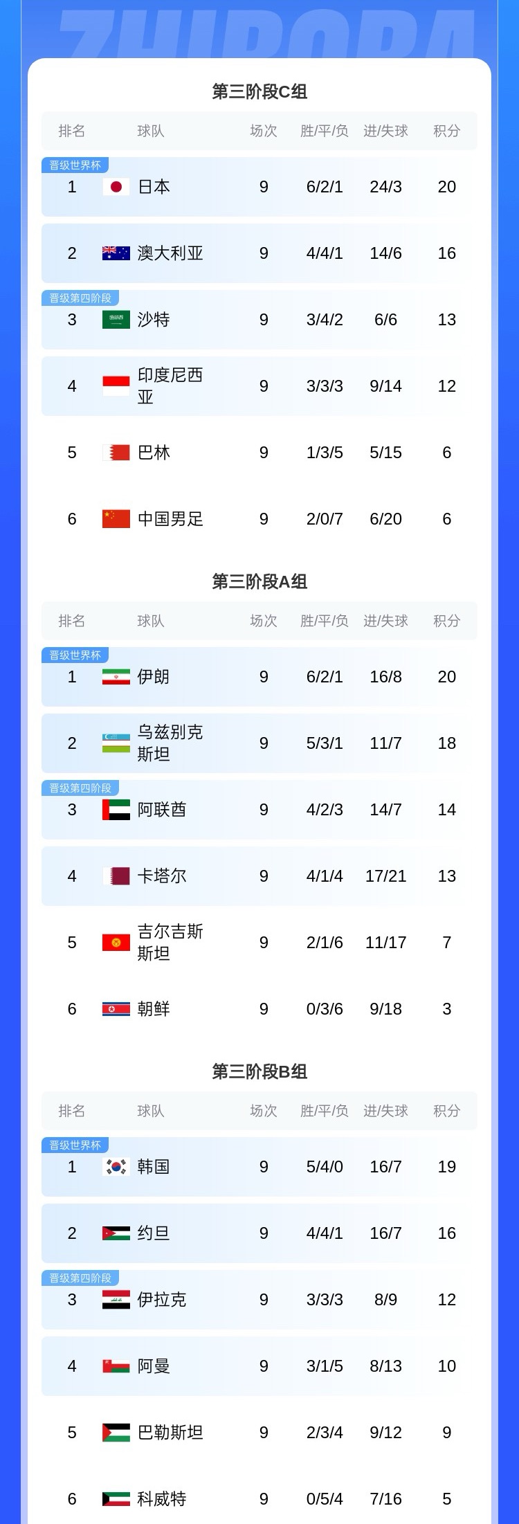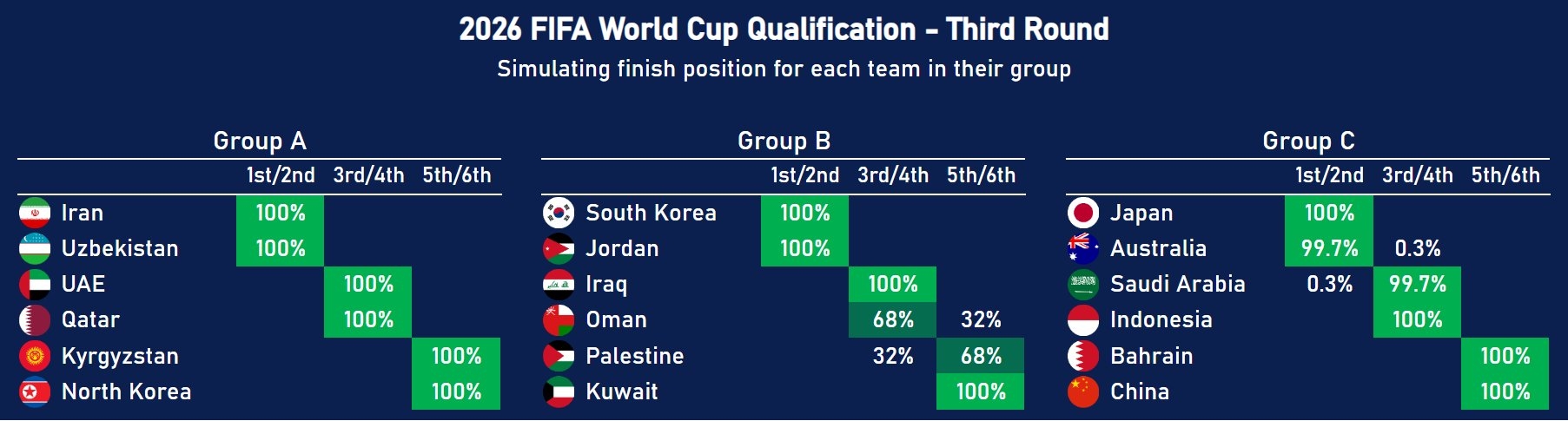 06月10日訊 世界杯預(yù)選賽亞洲區(qū)第三階段18強(qiáng)賽僅剩最后一輪,各隊(duì)的世界杯晉級(jí)形勢已基本明朗。數(shù)據(jù)機(jī)構(gòu)Footy Rankings給出了最新的各組晉級(jí)、附加賽以及出局的概率。