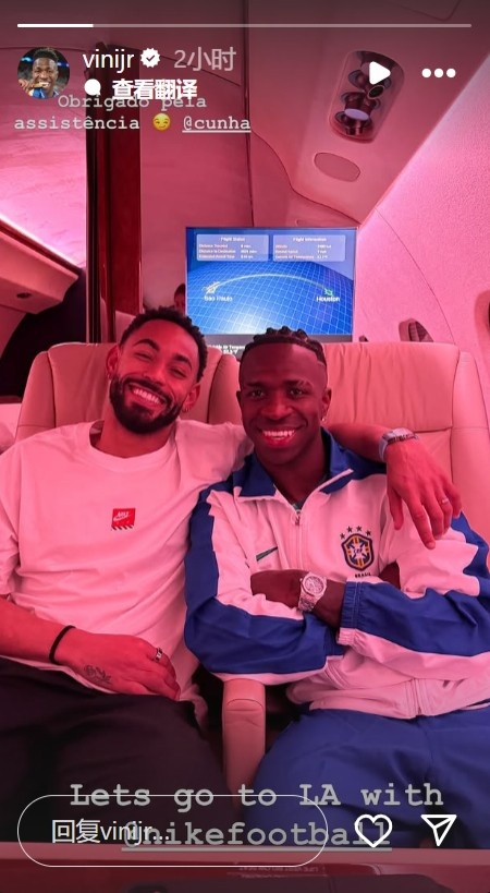 6月11日訊 維尼修斯更新社媒,他與庫尼亞一同前往美國。