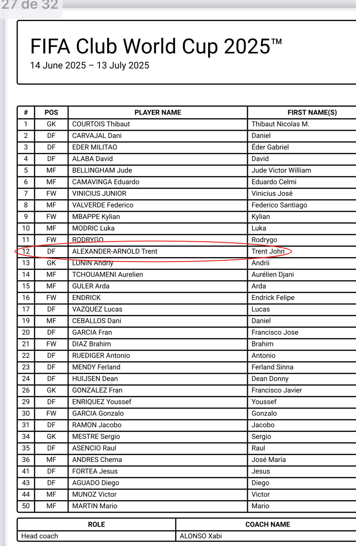 06月12日訊 世俱杯官方公布各個參賽球隊名單,皇馬新援阿諾德將身穿12號球衣,而非此前在利物浦一直身穿的66號。
