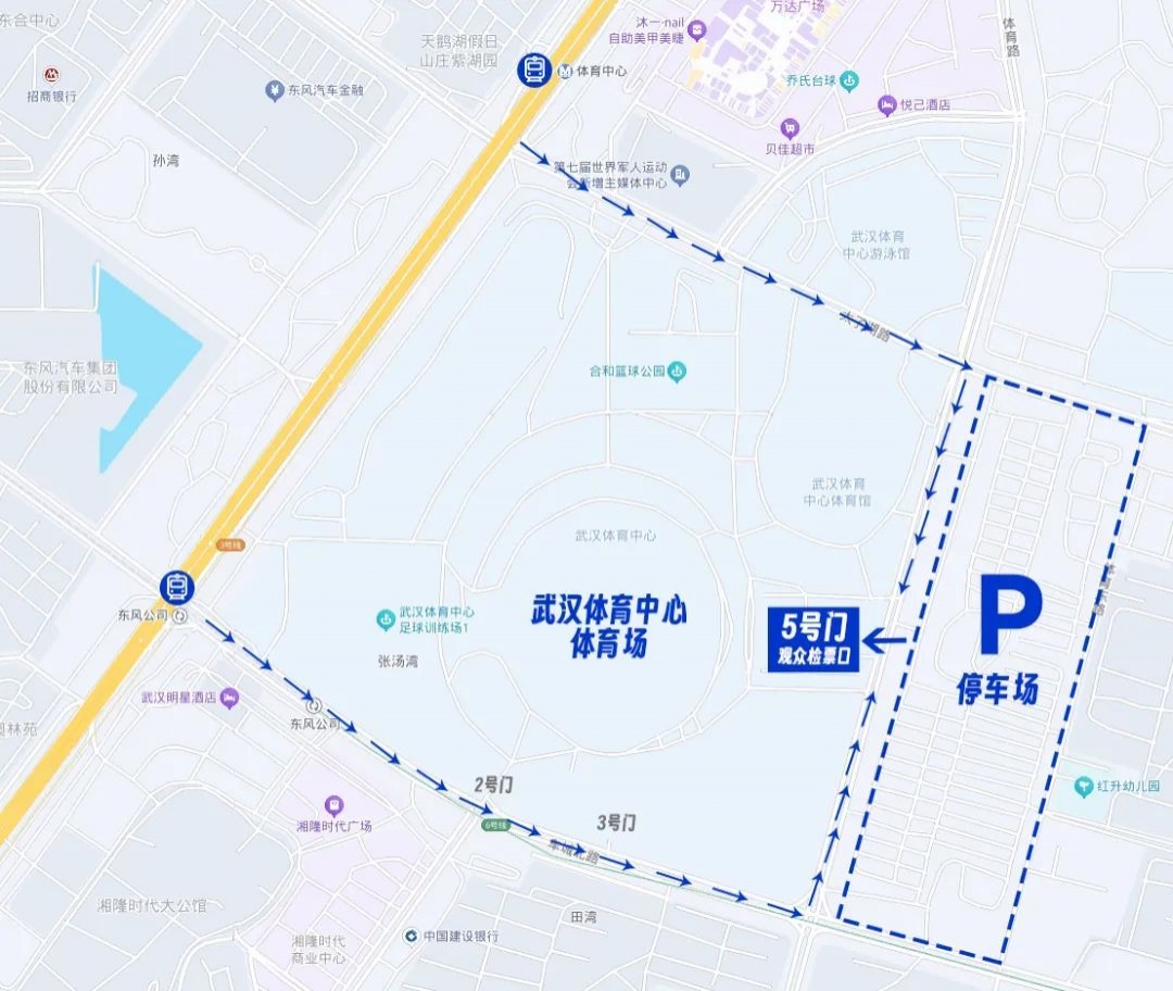 1、比賽觀眾入口為武漢體育中心5號門,球迷朋友們可乘坐地鐵3號線在“體育中心”或“東風(fēng)公司”站下車,或乘坐地鐵6號線在“東風(fēng)公司”站下車,步行前往5號門入口。自駕前往體育場的球迷朋友可將車輛停放至體育中心5號門公共停車場,或周邊商圈停車場,再步行前往入口。