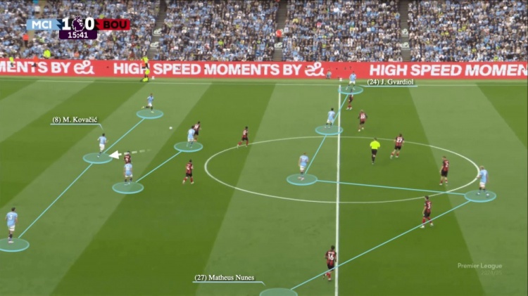 傷病問題是圣誕節(jié)前狀態(tài)下滑的催化劑,但近幾個(gè)月來,曼城已顯現(xiàn)復(fù)蘇的跡象。瓜迪奧拉通過調(diào)整戰(zhàn)術(shù)體系,使邊后衛(wèi)在曼城進(jìn)攻時(shí)能保持更靠前、更寬闊的站位。下圖所示,即為他們?cè)谟⒊詈笠粋€(gè)主場(chǎng)對(duì)陣伯恩茅斯時(shí)的場(chǎng)景,在組織進(jìn)攻階段,科瓦西奇回撤至防線,形成3-2-5陣型。