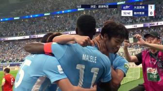 第52分鐘,大連右路進攻,馬萊萊突破下底橫掃門前,朱鵬宇前點鏟射入網(wǎng),大連1-0領(lǐng)先↓