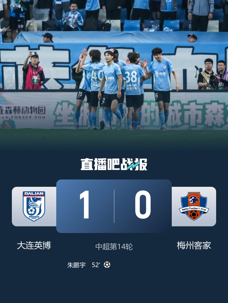下半場補時5分鐘。最終全場比賽結(jié)束,大連英博1-0梅州客家。