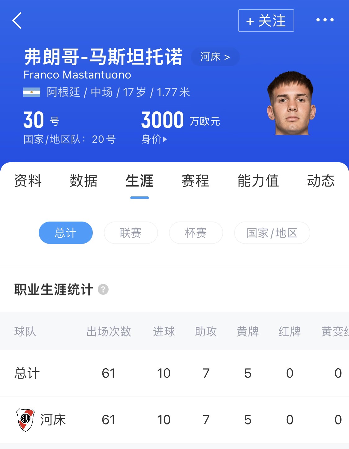 馬斯坦托諾現(xiàn)年17歲,阿根廷中場,出自河床青訓,目前身價3000萬歐。今年8月14日,他將滿18歲。