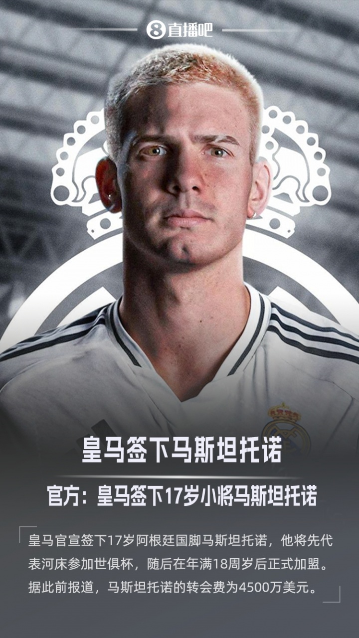 6月13日訊 官方消息,皇馬簽下17歲阿根廷國腳馬斯坦托諾,他將先代表河床參加世俱杯,隨后在年滿18周歲后正式加盟。