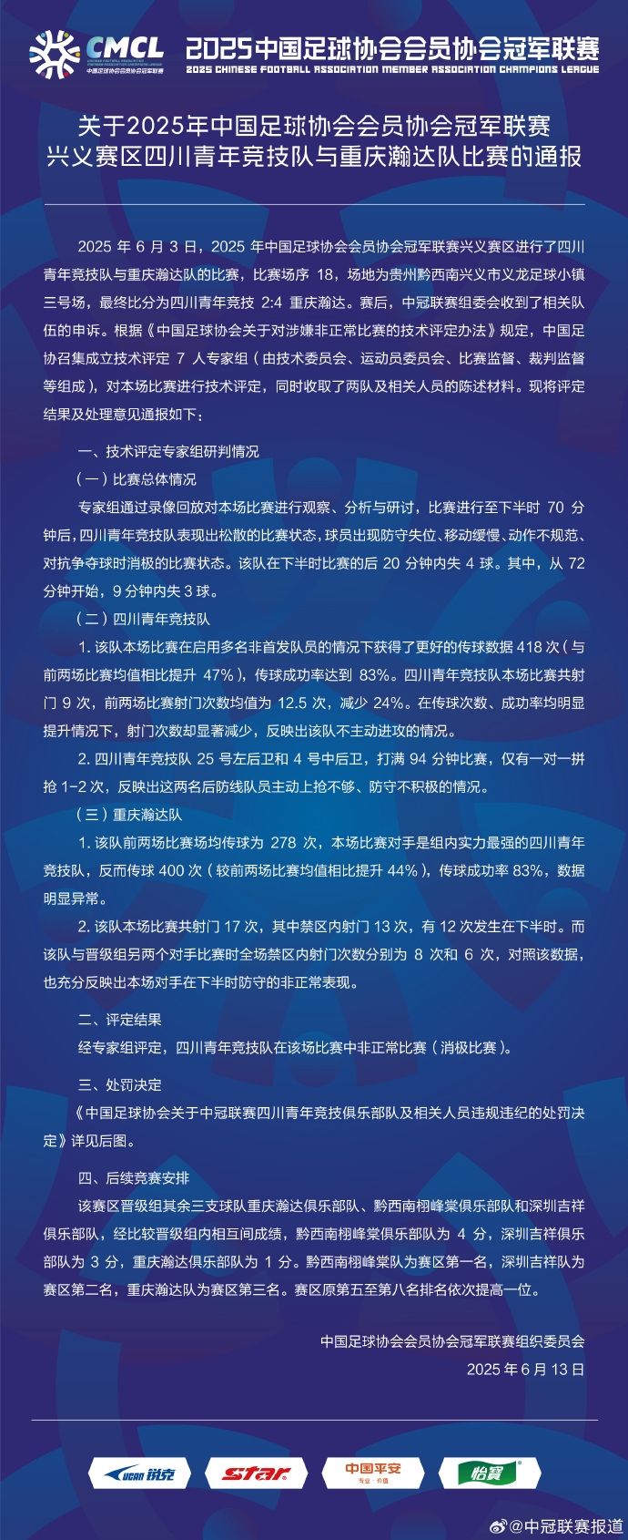 06月20日訊 中冠官方發(fā)布通報(bào),6月3日中冠四川青年競(jìng)技 2:4 重慶瀚達(dá)的比賽中,經(jīng)專家組評(píng)定,四川青年競(jìng)技隊(duì)在該場(chǎng)比賽中非正常比賽(消極比賽)。