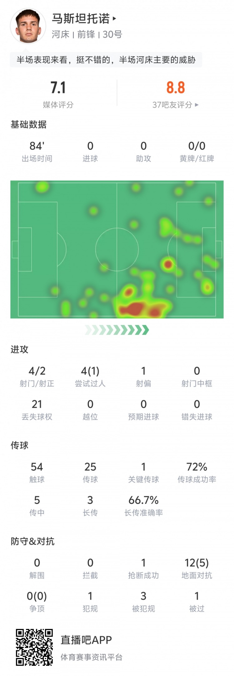 6月22日訊 世俱杯,河床0-0戰(zhàn)平蒙特雷,17歲阿根廷國(guó)腳馬斯坦托諾首發(fā)出戰(zhàn)并在第84分鐘被換下,全場(chǎng)數(shù)據(jù)如下。