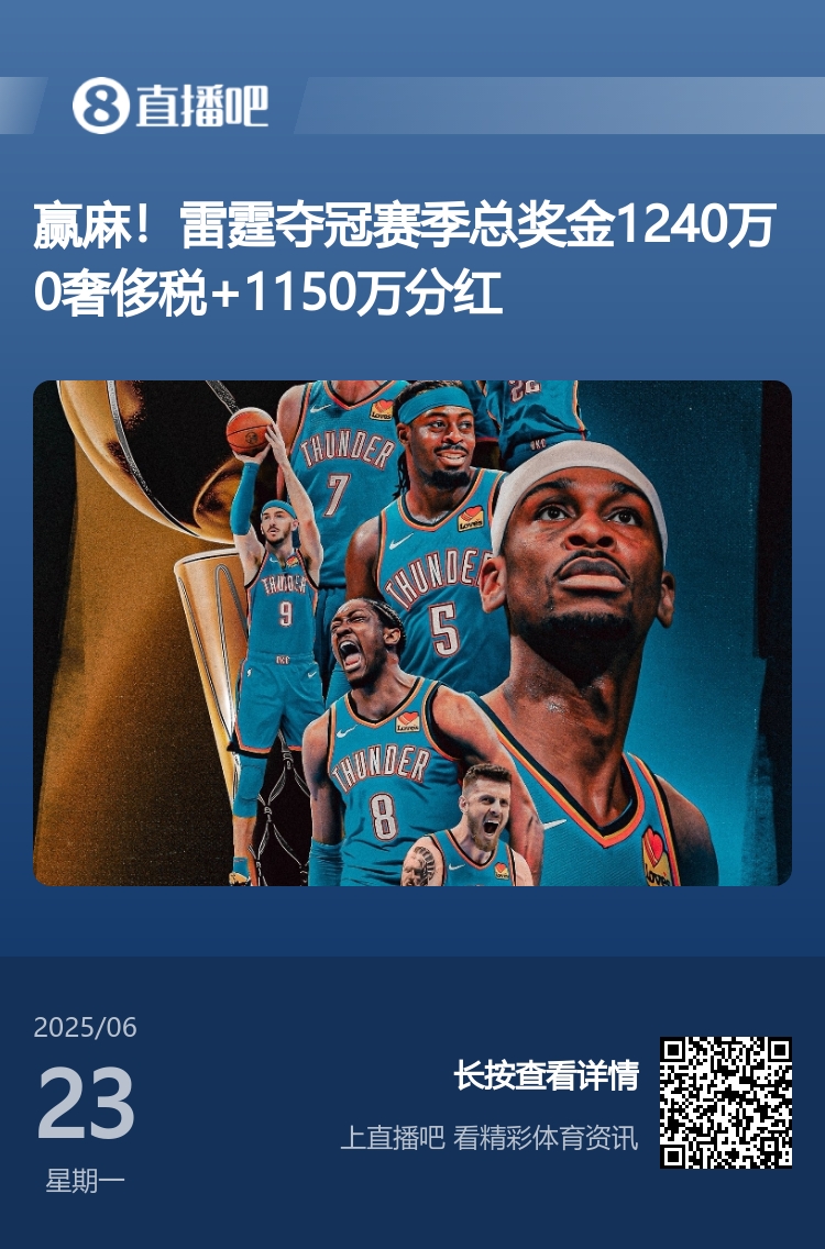 本賽季雷霆一共從聯(lián)盟那里拿到1240萬美元的賽季獎金。而步行者這邊則獲得了616萬美元。