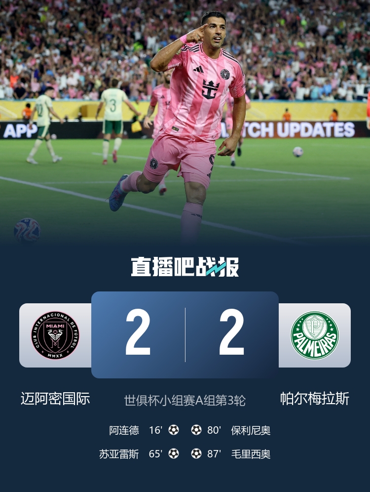 6月24日訊 北京時間6月24日9點,世俱杯A組第3輪,邁阿密國際對陣帕爾梅拉斯。上半場,蘇亞雷斯助攻阿連德單刀破門,塞爾克拉傷退,托雷斯錯失良機。下半場,阿連德單刀打偏,蘇亞雷斯一條龍得手,保利尼奧和毛里西奧連扳兩球。最終邁阿密國際2-2遭帕爾梅拉斯絕平。小組賽結(jié)束,兩隊同積5分?jǐn)y手晉級,帕爾梅拉斯以凈勝球優(yōu)勢排小組第一,邁阿密國際小組第二,邁阿密國際將對陣巴黎圣日耳曼。