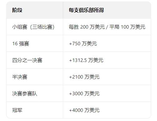 世俱杯小組賽階段贏球每場(chǎng)200萬(wàn)美元,平局100萬(wàn)美元。