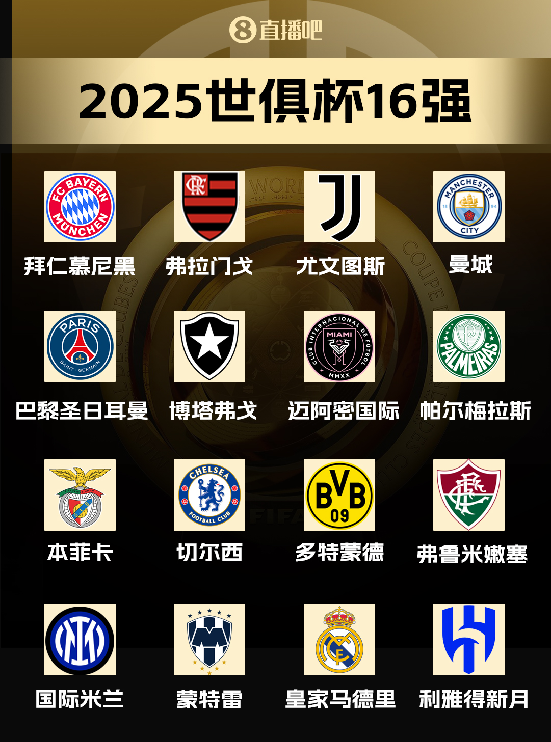 帕爾梅拉斯、邁阿密國際、巴黎、博塔弗戈、本菲卡、拜仁、弗拉門戈、切爾西、國米、蒙特雷、多特、弗魯米嫩塞、曼城、尤文、皇馬、新月