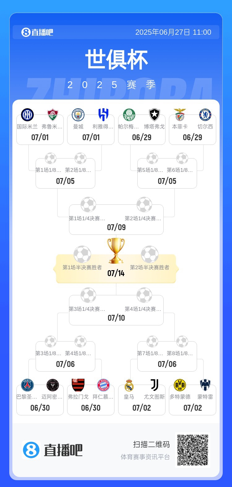 06月27日訊 今日世俱杯小組賽全部結(jié)束,16強塵埃落定!淘汰賽對陣已經(jīng)出爐。