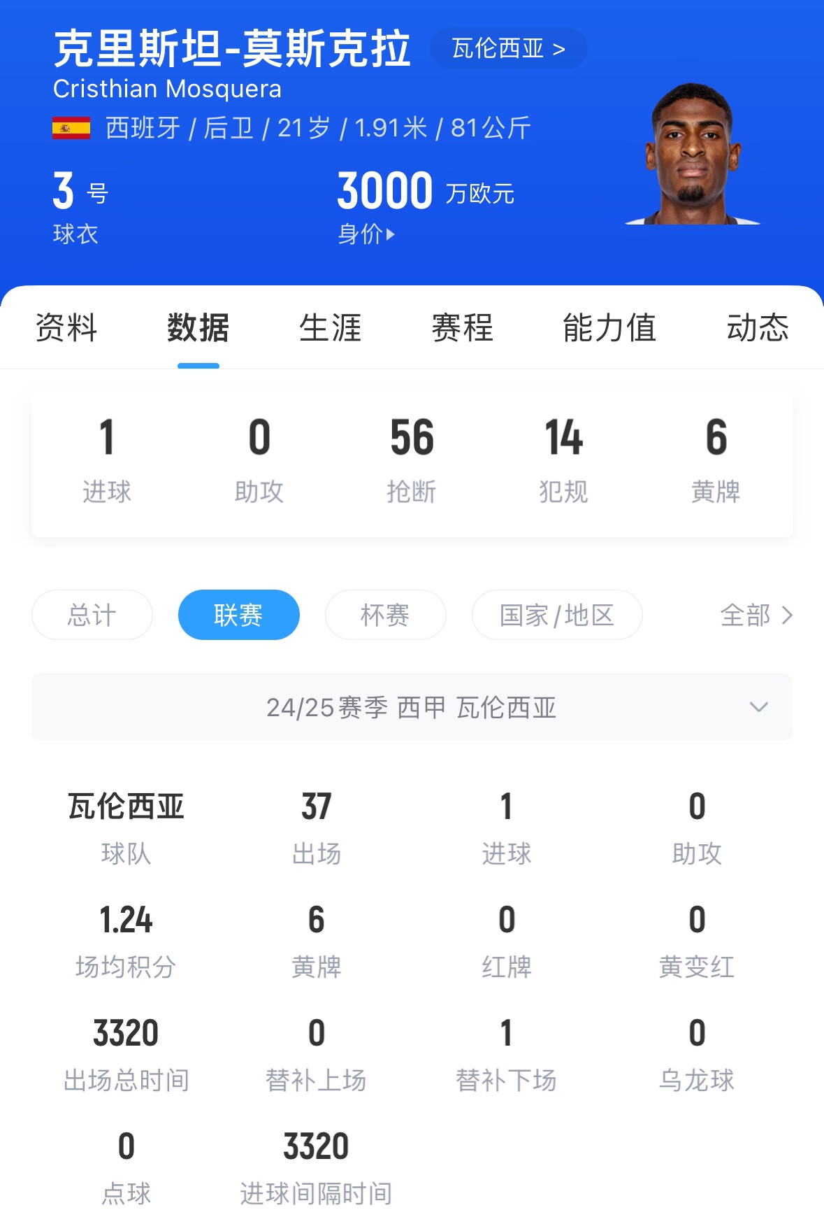 莫斯克拉現(xiàn)年21歲,身高1米91,他與瓦倫西亞的合同2026年到期,上賽季出戰(zhàn)41場比賽,打進1球,目前身價3000萬歐元。