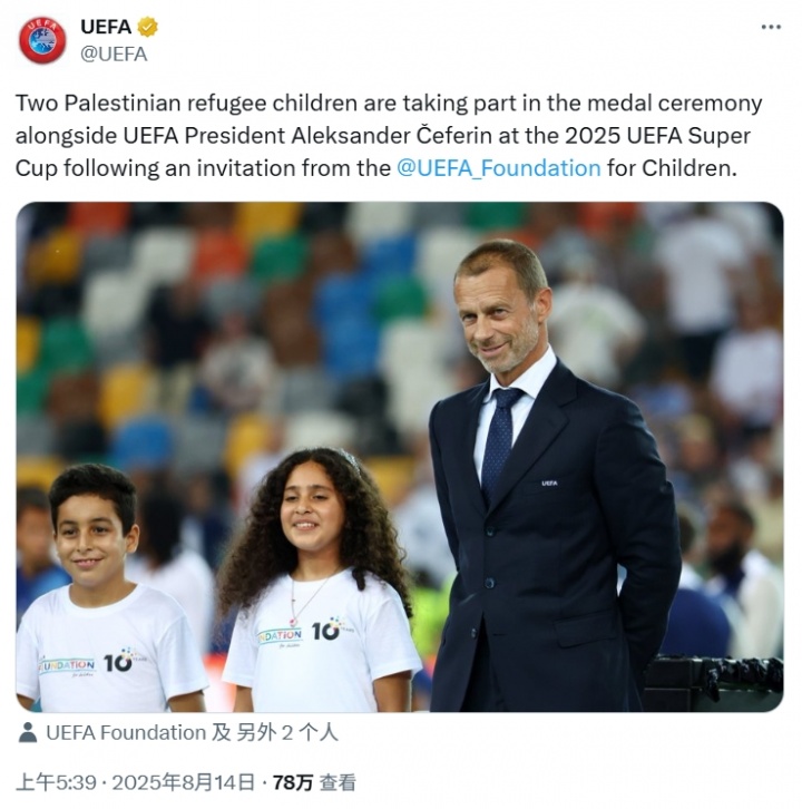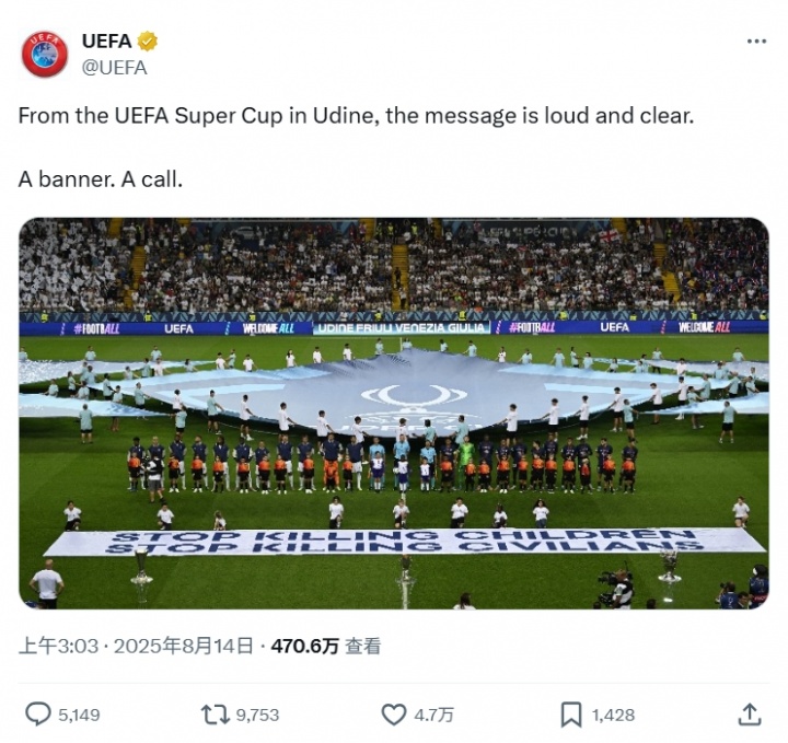 歐足聯(lián)官方在社交平臺(tái)上配文寫道:“來自烏迪內(nèi)的歐洲超級(jí)杯現(xiàn)場,這則信息響亮且清晰,一面標(biāo)語,一次號(hào)召?!边@一標(biāo)語并沒有明確針對(duì)的對(duì)象,但歐足聯(lián)在活動(dòng)期間還邀請(qǐng)了兩名來自巴勒斯坦的難民兒童參加頒獎(jiǎng)儀式,指向性十分明確。