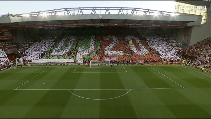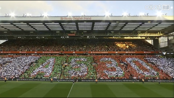 08月16日訊 利物浦vs伯恩茅斯,英超揭幕戰(zhàn),本場(chǎng)賽前,安菲爾德全場(chǎng)高唱you'll never walk alone,悼念過世的若塔。