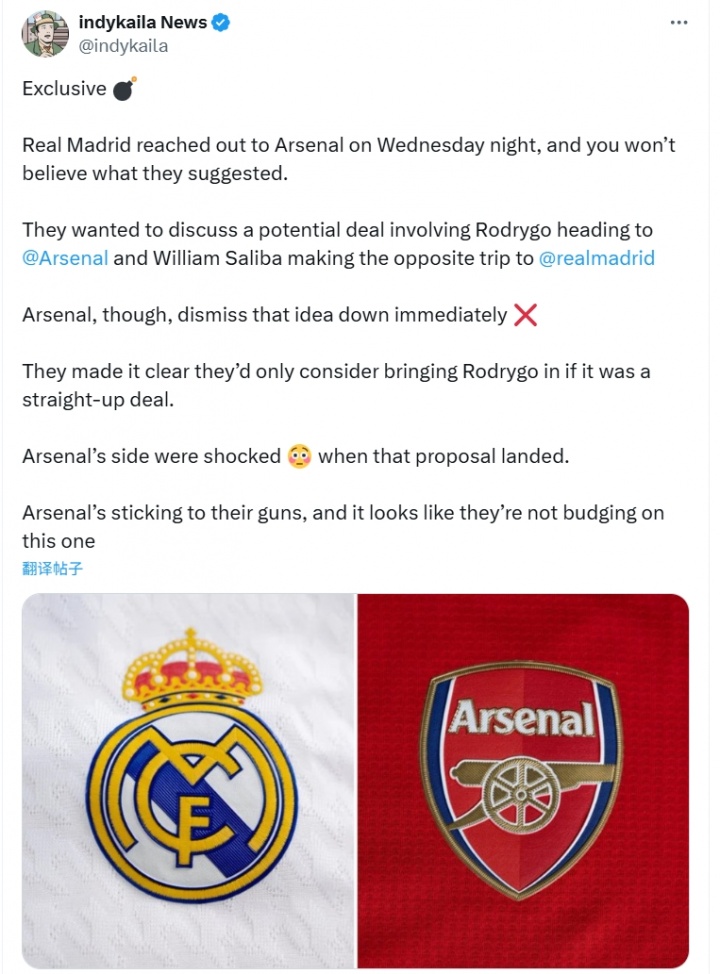 阿森納立即拒絕了這一提議。他們明確表示,他們只會考慮直接交易以引進羅德里戈。阿森納方面對皇馬的提議感到震驚。