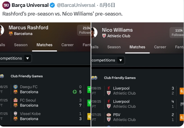 西班牙媒體eldesmarque報(bào)道,此前眾多網(wǎng)友在社媒批評尼科與畢爾巴鄂續(xù)約后的季前賽表現(xiàn),還有巴薩球迷號拿尼科與拉什福德季前賽表現(xiàn)對比。