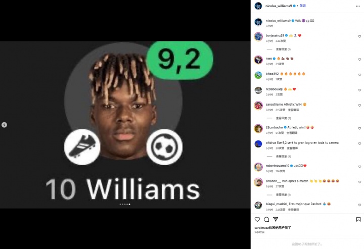 賽后,尼科在社媒曬照,其中有一張是自己本場評分9.2分。