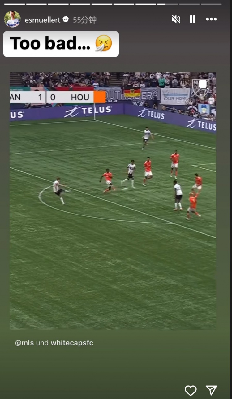 穆勒此役替補(bǔ)出場(chǎng)上演溫哥華白浪首秀,他在禁區(qū)弧頂處遠(yuǎn)射破門,但因隊(duì)友越位在先,進(jìn)球被取消。