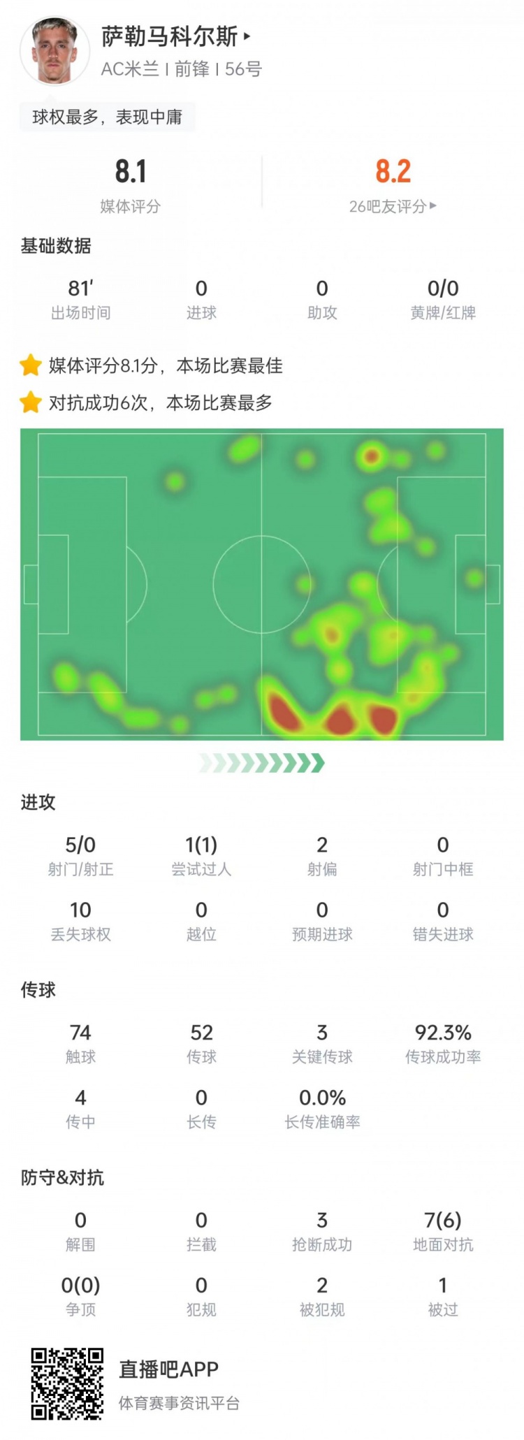 此役薩勒馬科爾斯首發(fā)出戰(zhàn),送出3記關(guān)鍵傳球,幫助米蘭取勝,米蘭官方宣布,他當(dāng)選本場(chǎng)比賽隊(duì)內(nèi)最佳球員。
