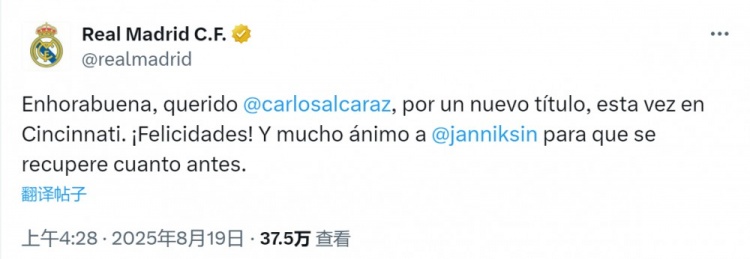 皇馬官方更新社媒動(dòng)態(tài),祝賀阿爾卡拉斯奪冠:“親愛(ài)的阿爾卡拉斯,祝賀你又一次奪冠,這次是在辛辛那提!也祝愿辛納早日康復(fù)?!?/p>