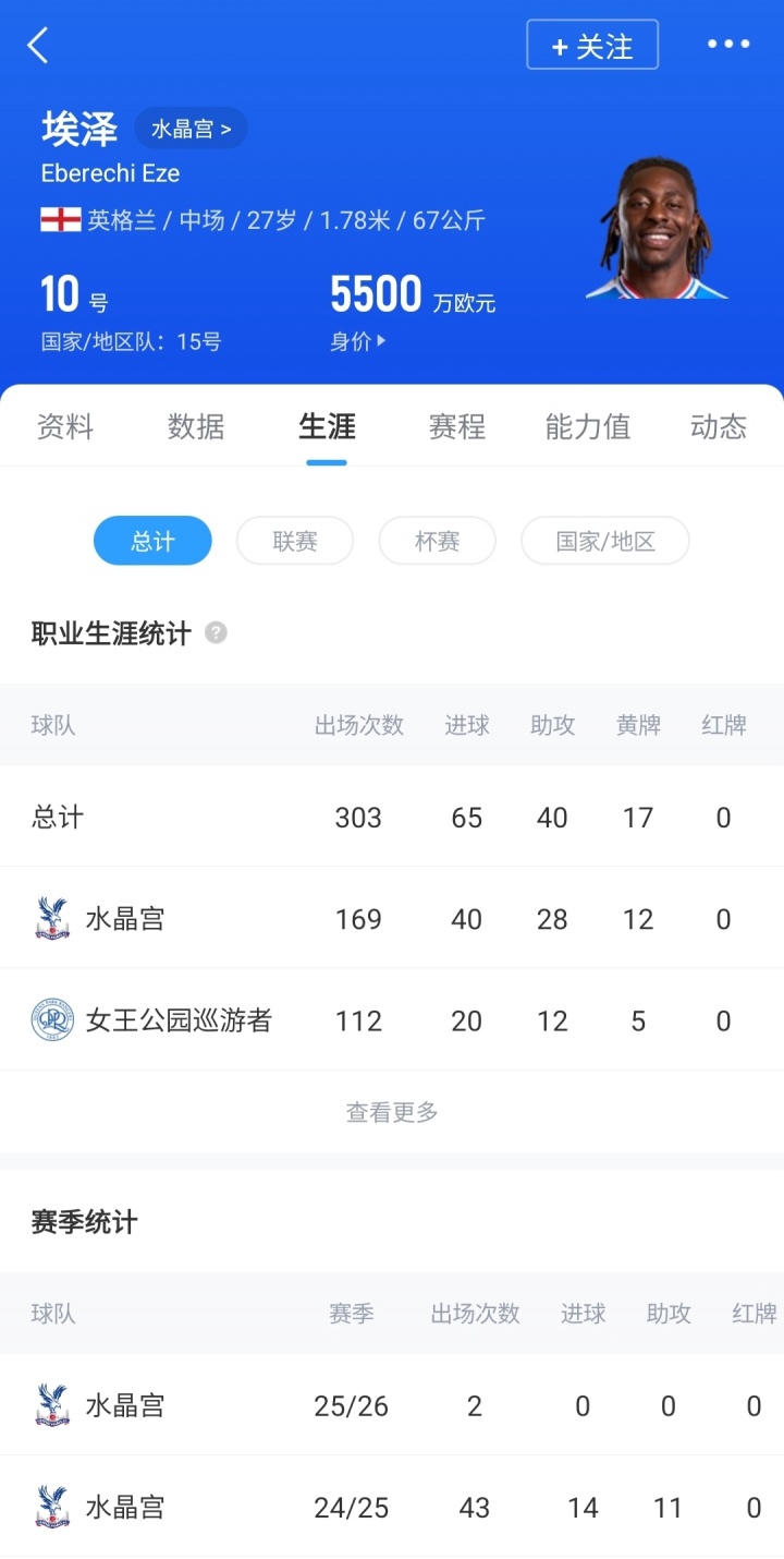 27歲的英格蘭前腰埃澤,上賽季為水晶宮出戰(zhàn)43場(chǎng)比賽,貢獻(xiàn)14球11助,目前德轉(zhuǎn)身價(jià)5500萬歐。