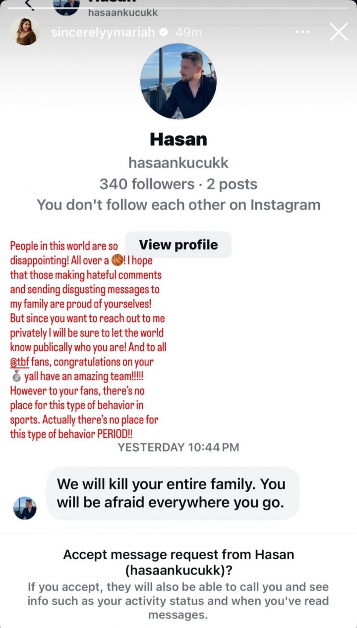 “這世界上的有些人真的讓人失望!就因為一場籃球比賽,那些向我的家人發(fā)送仇恨言論、發(fā)送惡心信息的人,希望你們好自為之!”