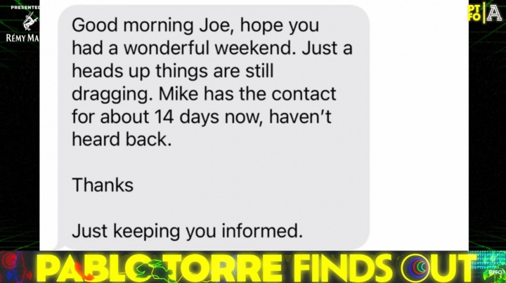 Pablo表示,他可以證實,這就是小卡舅舅Dennis Robertson和Joe Sandberg關(guān)于額外2000萬股票合同的溝通短信截圖,最終這個4800萬合同中2000萬的股票是在四年內(nèi)從Aspiration公司創(chuàng)始人之一的Joe Sandberg個人持股中支付。