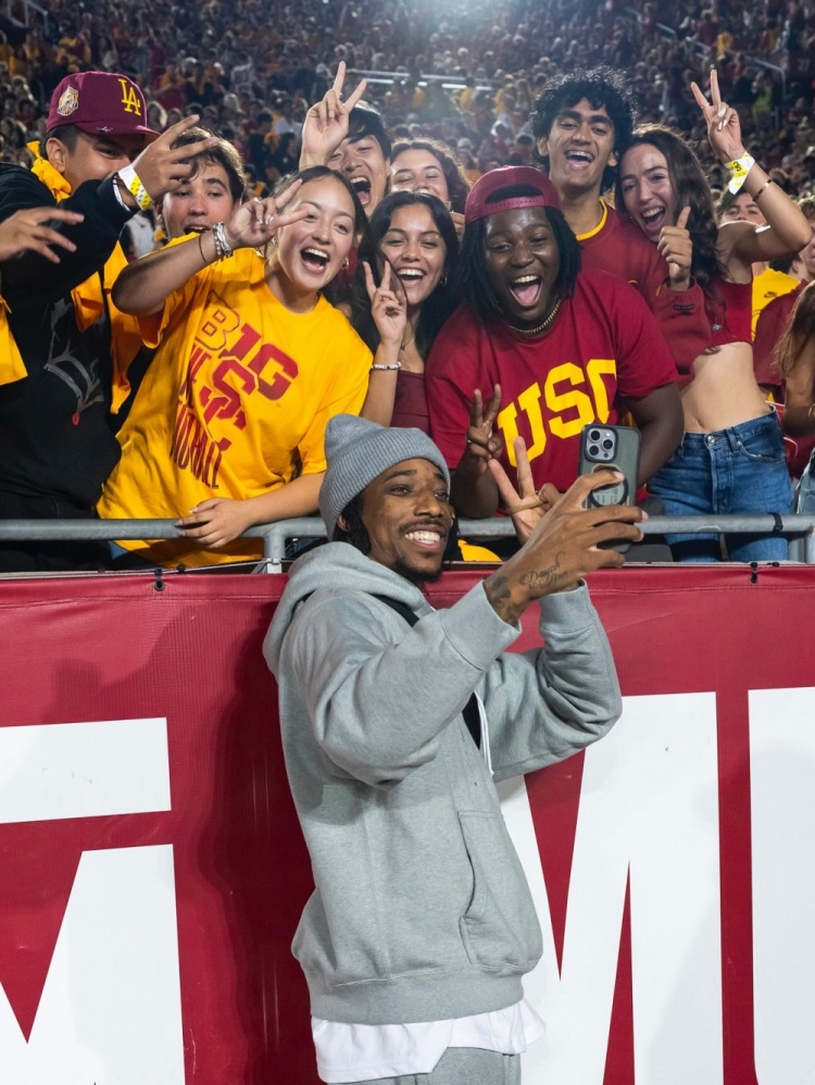 9月22日訊 南加大籃球隊社媒更新動態(tài),曬出了校友、NBA球員德羅贊回到母校觀看校橄欖球隊的比賽照片,德羅贊在現(xiàn)場也是熱情的和學(xué)弟、學(xué)妹們互動。