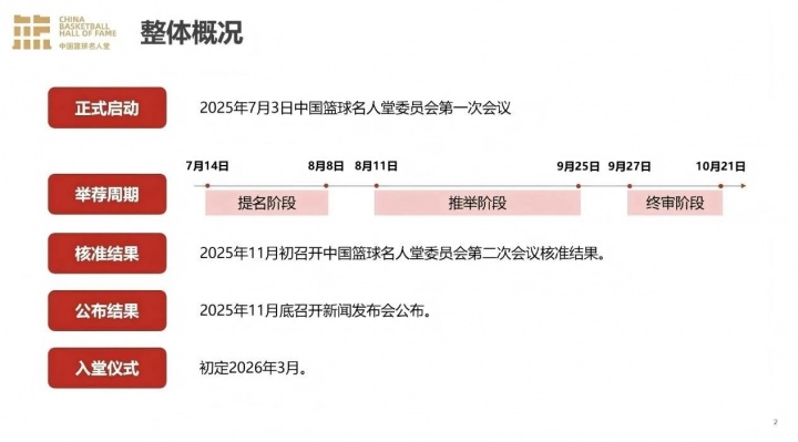 2025年中國籃球名人堂的入堂規(guī)模計劃為9名個人和1個集體,具體包括:杰出運動員4人(男女各2人)、杰出教練員1人、杰出裁判員1人、中國籃球先行者3人,以及優(yōu)秀集體1個,其中中國籃球先行者(3人)由名人堂執(zhí)行辦公室組建“中國籃球先行者舉薦專業(yè)委員會”負責提名,直接進入終審階段。