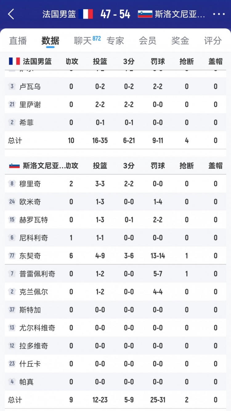 上半場,法國男籃11罰9中,而斯洛文尼亞獲得驚人的31次罰球,命中25個,其中東契奇?zhèn)€人14罰13中。