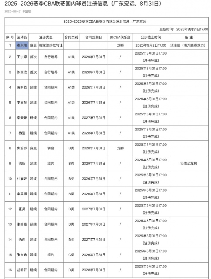 CBA官網(wǎng)今天更新了國內(nèi)球員注冊信息,廣東為崔永熙完成預(yù)注冊。
