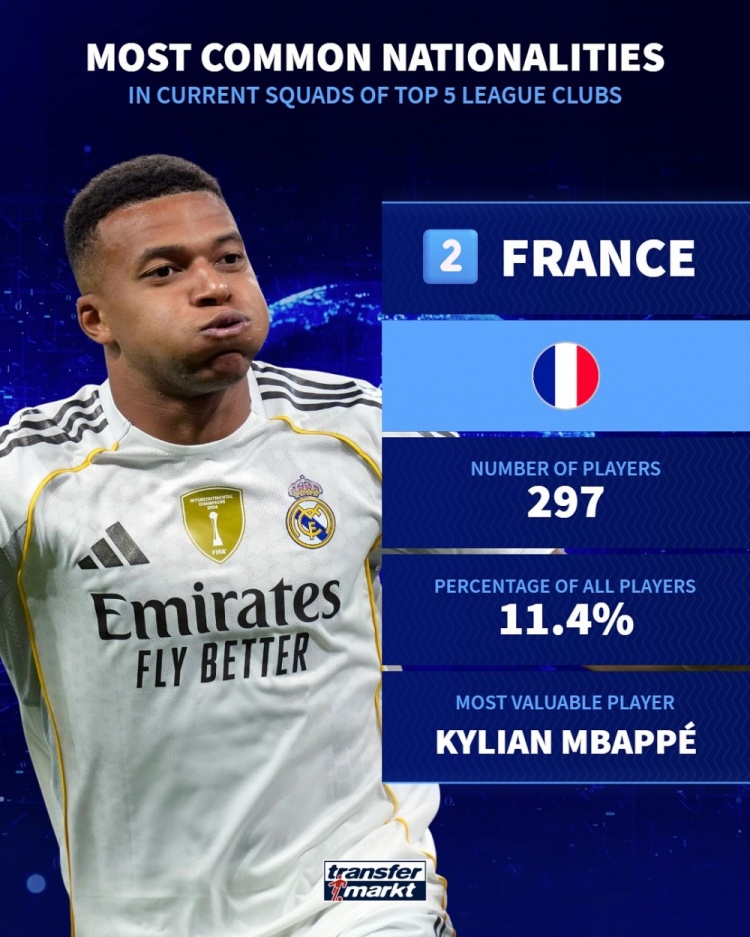 9月16日訊 德國轉(zhuǎn)會市場統(tǒng)計了五大聯(lián)賽各國球員的數(shù)量,并列出榜單,西班牙337人居首。