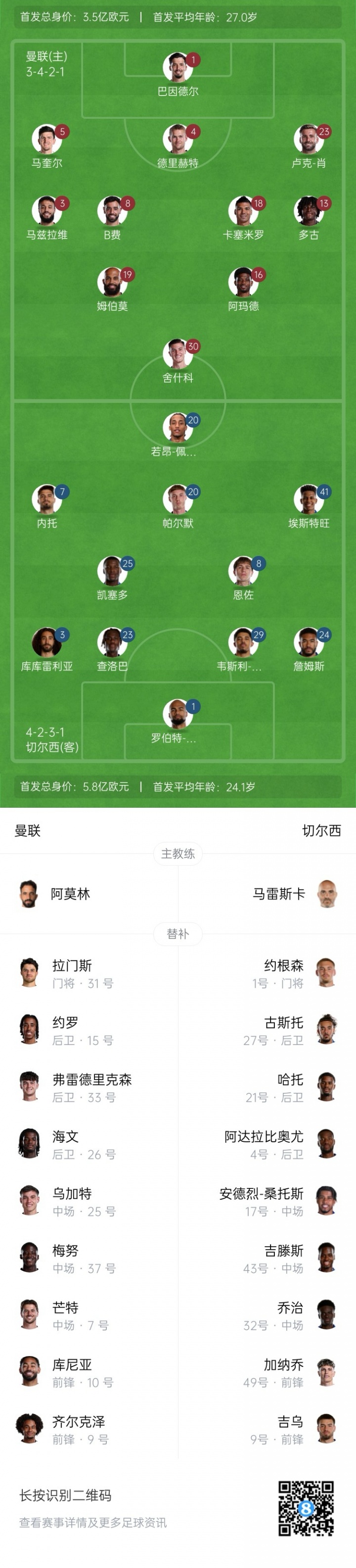 曼聯(lián)首發(fā):1-巴因德?tīng)枴?3-盧克-肖、4-德里赫特、5-馬奎爾、13-多古、3-馬茲拉維、18-卡塞米羅、8-B費(fèi)、19-姆伯莫、30-舍什科、16-阿瑪?shù)隆さ蟻喡?/strong>