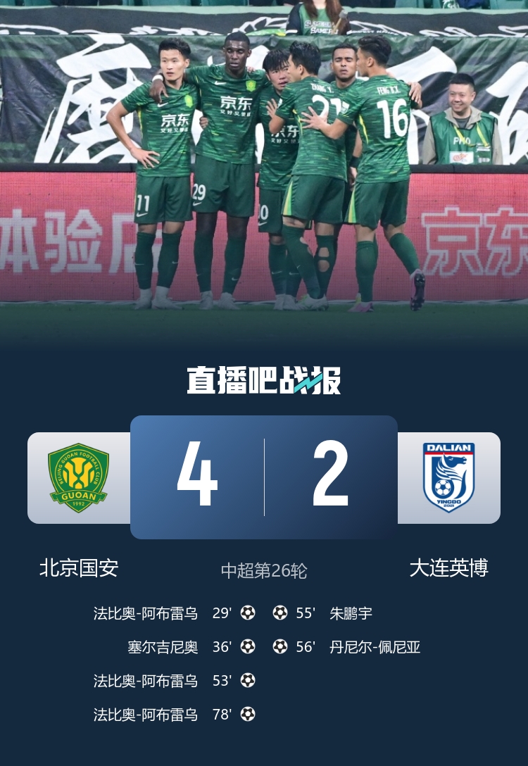 下半場(chǎng)補(bǔ)時(shí)7分鐘。最終全場(chǎng)比賽結(jié)束,北京國安4-2大連英博。