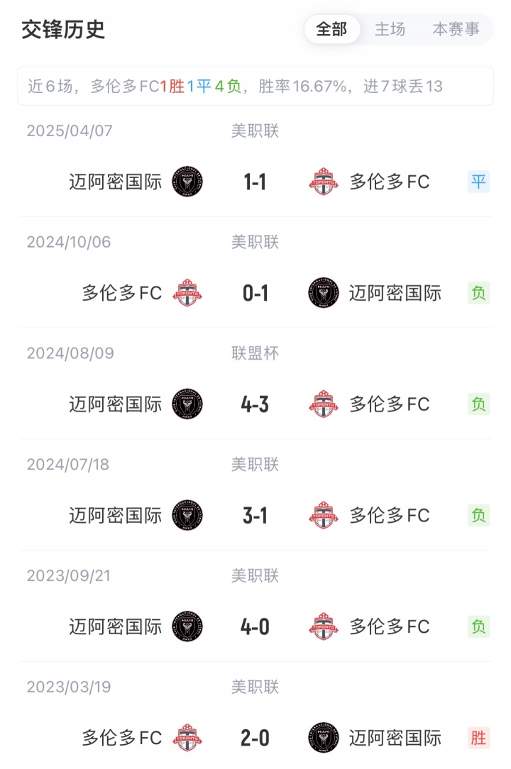 積分榜方面,邁阿密國(guó)際16勝7平6負(fù)積55分,近期收獲3連勝;多倫多FC5勝12平13負(fù)積27分,近8輪不勝且收獲6連平。邁阿密國(guó)際歷史對(duì)陣多輪多FC已5場(chǎng)不?。?勝1平)。
