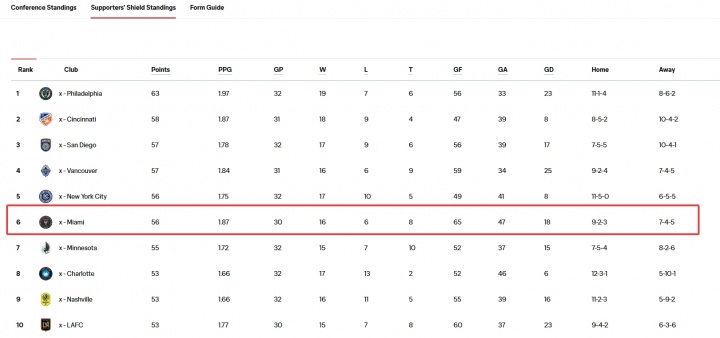 目前美職聯(lián)東西區(qū)的總排名上,費(fèi)城聯(lián)63分第一,辛辛那提58分第二,圣地亞哥、溫哥華白浪分列三四,紐約城和邁阿密?chē)?guó)際56分排在五六位。