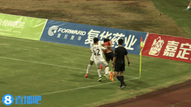 本場比賽進行到補時階段,此時上海嘉定匯龍1-2落后廣東廣州豹,柏佳駿后場準備開定位球,被廣東廣州豹球員阻擋。