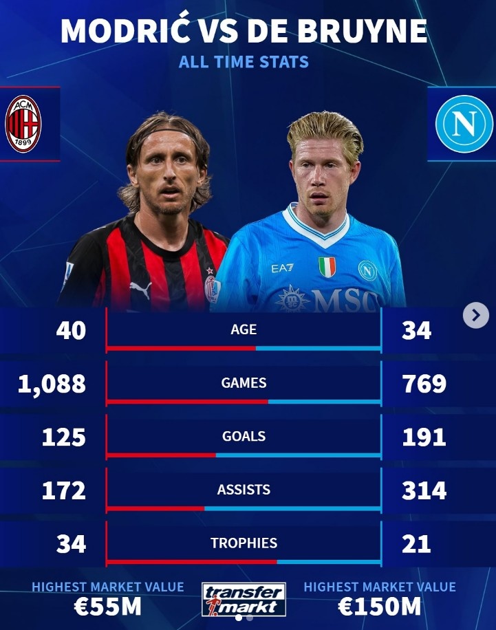 9月28日訊 本輪意甲AC米蘭將迎戰(zhàn)那不勒斯,德轉(zhuǎn)也對(duì)比兩隊(duì)中場(chǎng)莫德里奇與德布勞內(nèi)生涯數(shù)據(jù),具體如下: