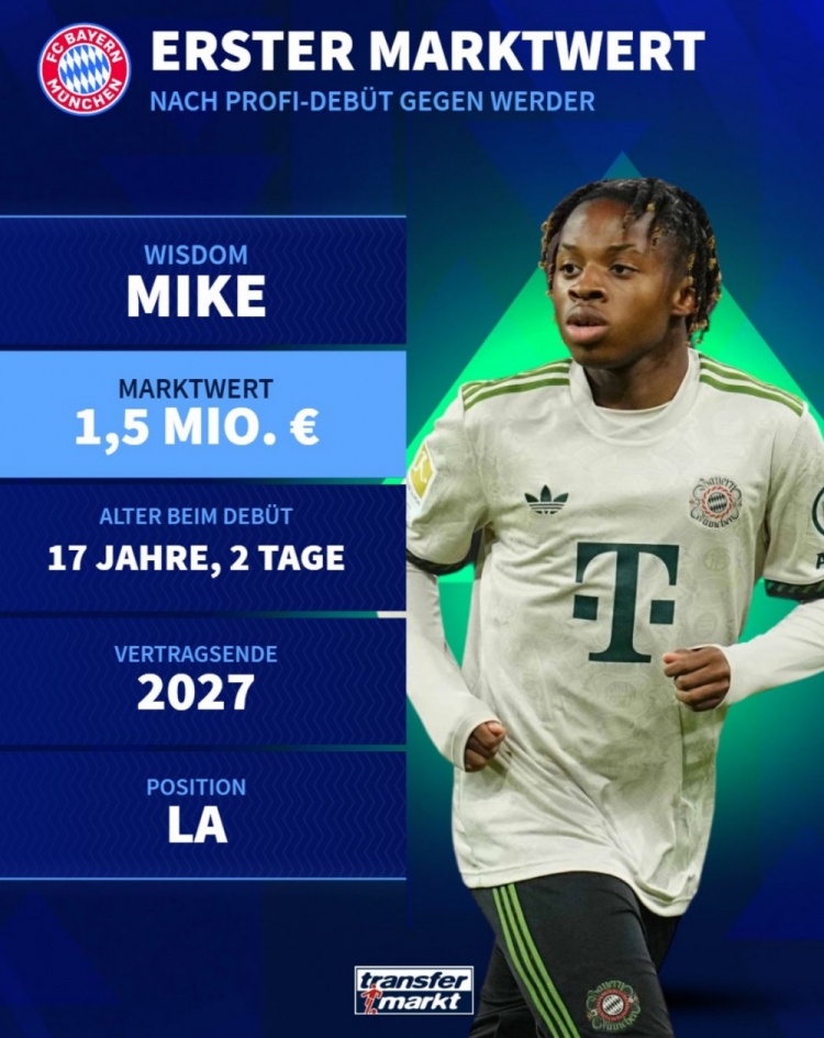 德轉也公布了麥克初始身價,為150萬歐,他與拜仁目前的合同將到2027年到期。