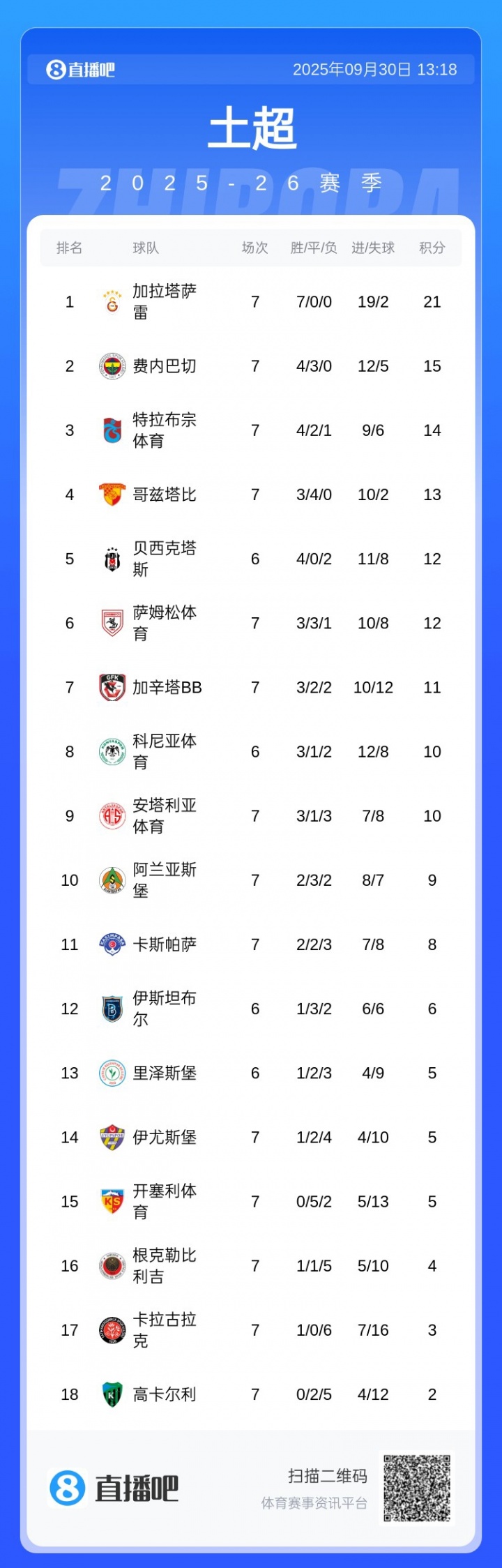 加拉塔薩雷本賽季在土超7場全勝領跑,進19球僅丟2球。