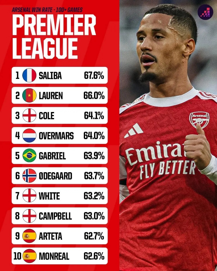 附阿森納球員英超勝率榜(至少出場100次):