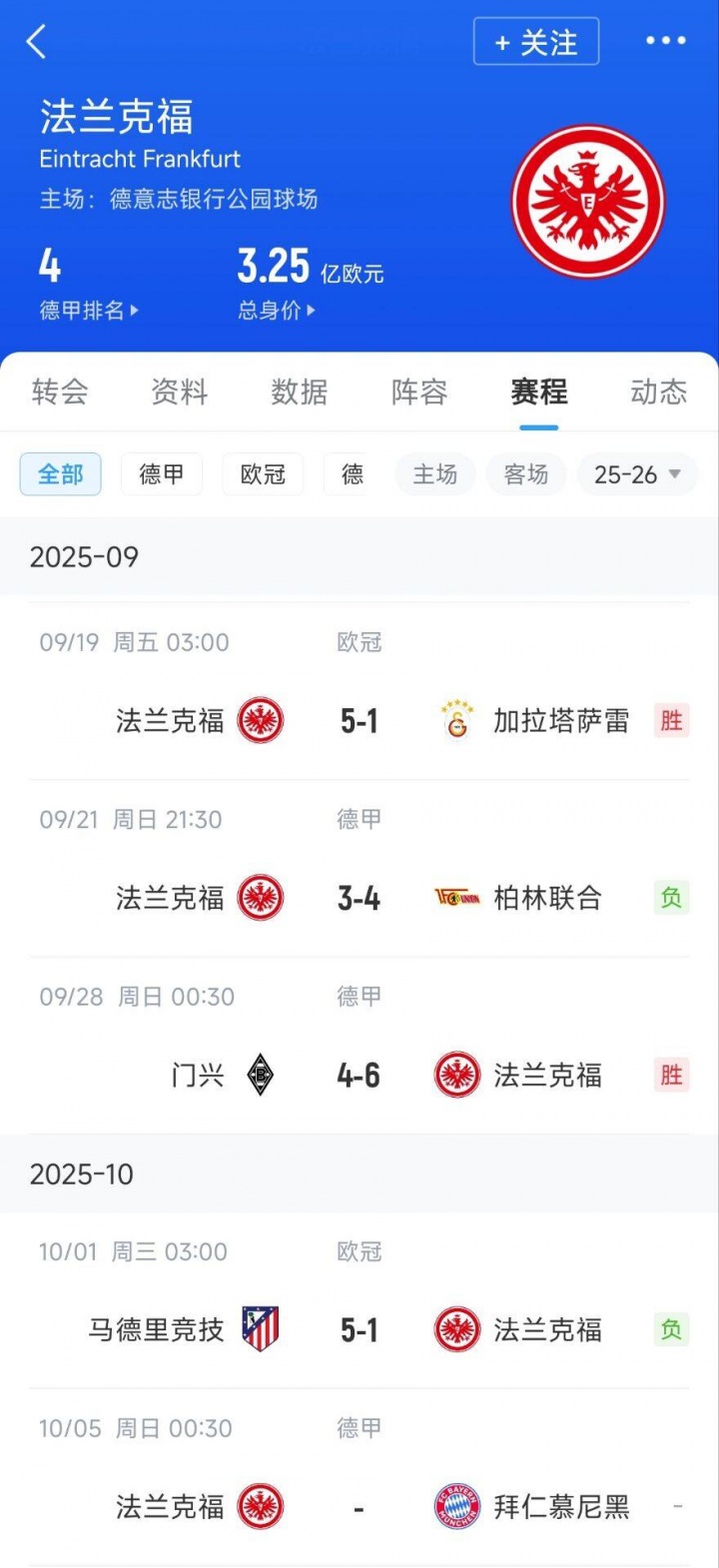 近4場比賽,法蘭克福的戰(zhàn)績:5-1加拉塔薩雷,3-4柏林聯(lián)合,6-4門興,1-5馬競,每場比賽至少6球,不是你死就是我亡。下一場比賽,法蘭克福主場迎戰(zhàn)拜仁。